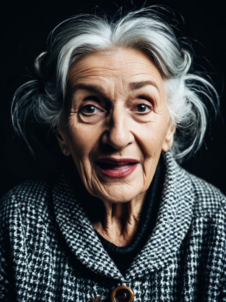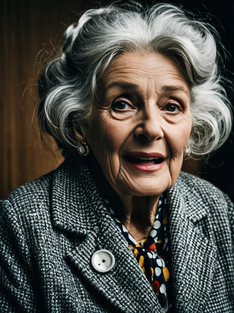 Portrait of an elderly woman with expressive wrinkles and white hair styled in a messy fashion, wearing a black and white checkered coat with a large button. The image features cinematic realism with a humorous and dramatic expression on her face, set against a dark background.