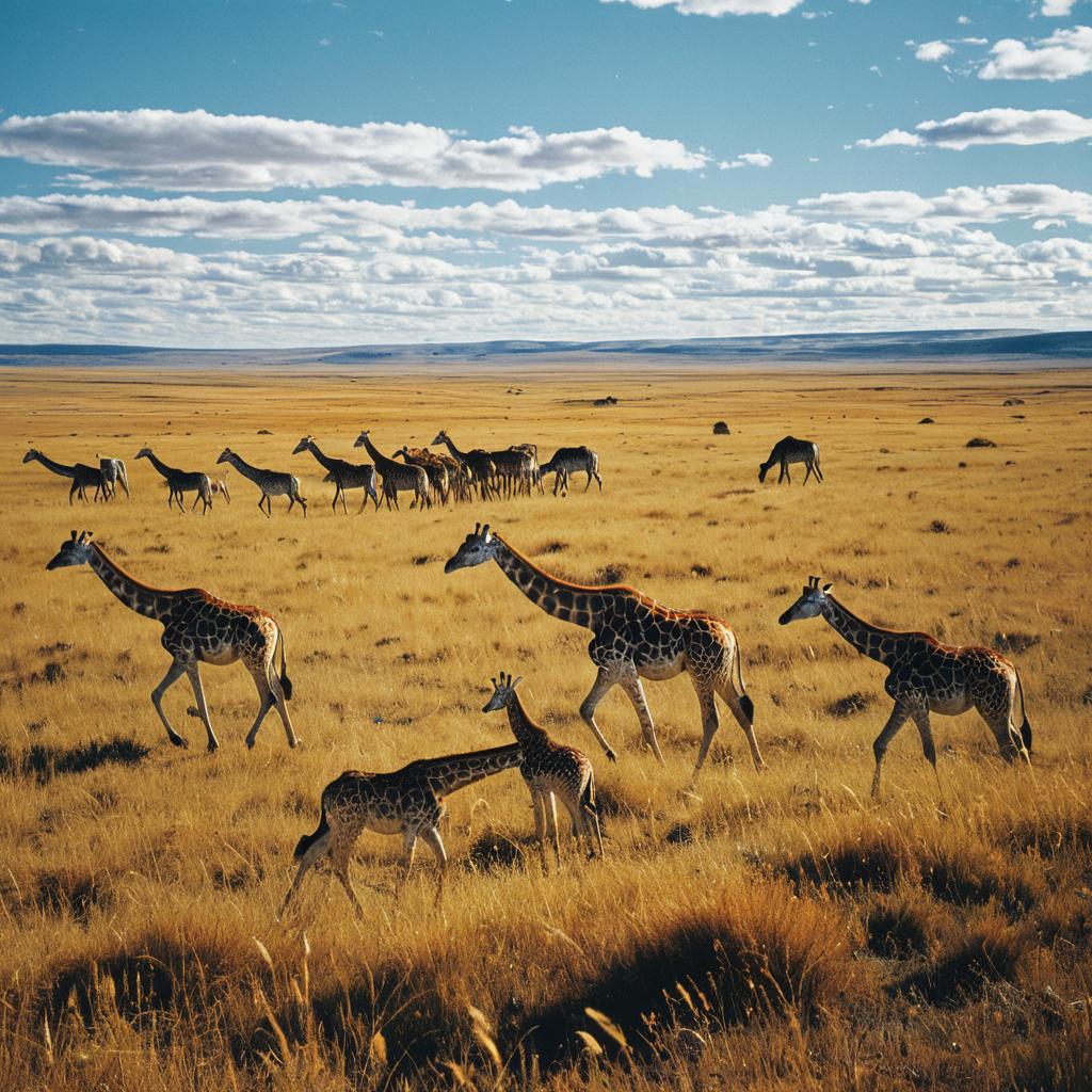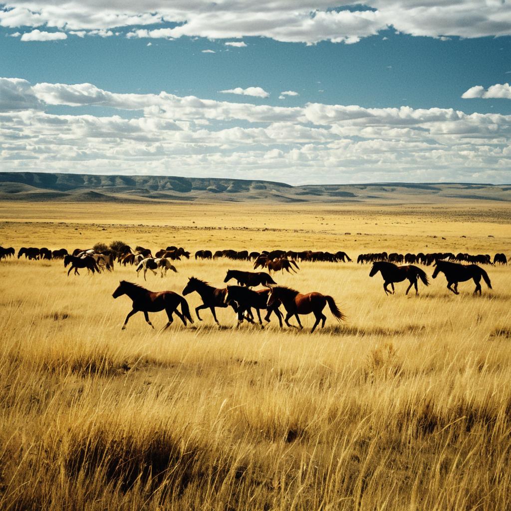 Image of an expansive, rolling savanna where the golden grasses sway in the breeze, and herds of wild mustangs roam freely beneath an endless, open sky