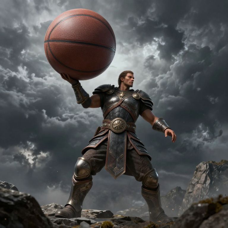 Digital artwork of a muscular gladiator in dark armor holding a basketball, standing on rocky terrain with a stormy sky.