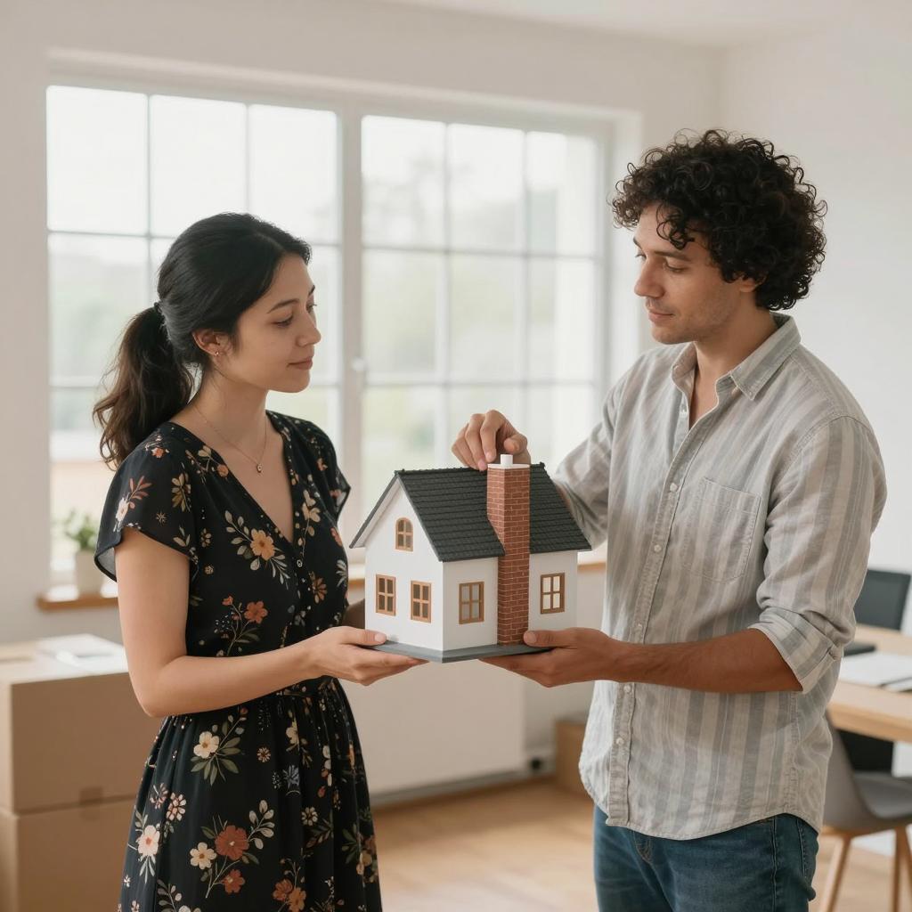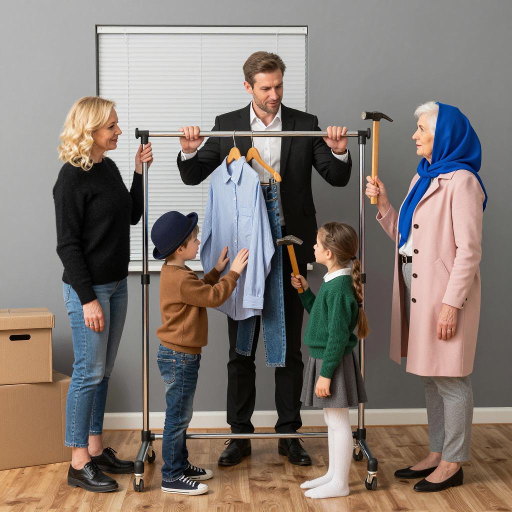 Family photograph. Six people, realistic style. Middle-aged man in black suit, standing behind metal clothing rack. Blonde woman in black sweater, blue jeans, left. Young boy in brown sweater, blue hat, right, pressing against rack. Young girl in green sweater, grey skirt, white socks, right, using hammer. Elderly woman in pink coat, blue headscarf, right, holding hammer. Two cardboard boxes on left. Wooden floor, grey wall background. Window with blinds behind rack. Family members interacting with clothing rack, focused expressions.