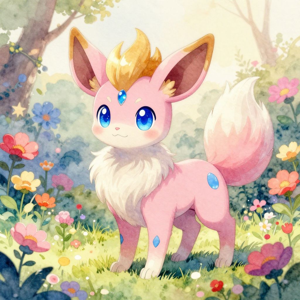 Highly detailed watercolor illustration of a fantasy creature resembling a Sylveon and Vulpix fusion. The creature features soft pastel pink and white fur, sparkling sapphire blue eyes, a golden mane, and distinct markings including a blue gem on its forehead and a blue spot on its leg. It stands in a vibrant, magical garden surrounded by colorful blossoms, illuminated with complementary and vivid colors, emphasizing a warm and stunning atmosphere.