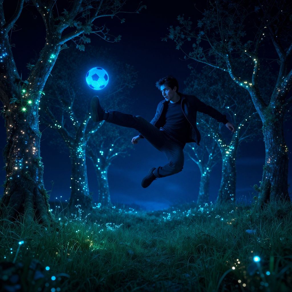 Magical nighttime scene: A man in mid-air, kicking a glowing blue soccer ball, surrounded by bioluminescent trees and grass that radiate an enchanting light. Soft, dreamlike ambiance, ethereal hues, surreal landscape, magical atmosphere, captivating composition, vivid colors, enchanting detail. Man has masculine face and piercing eyes