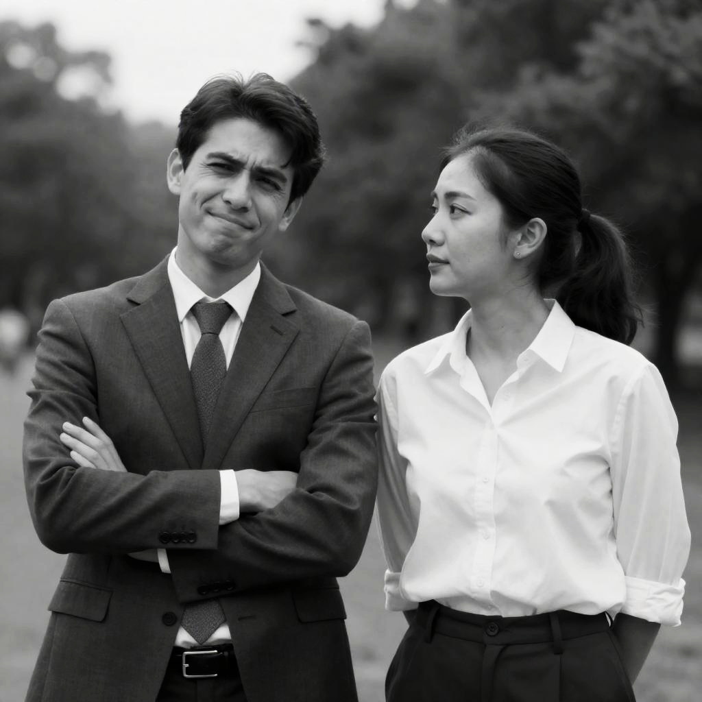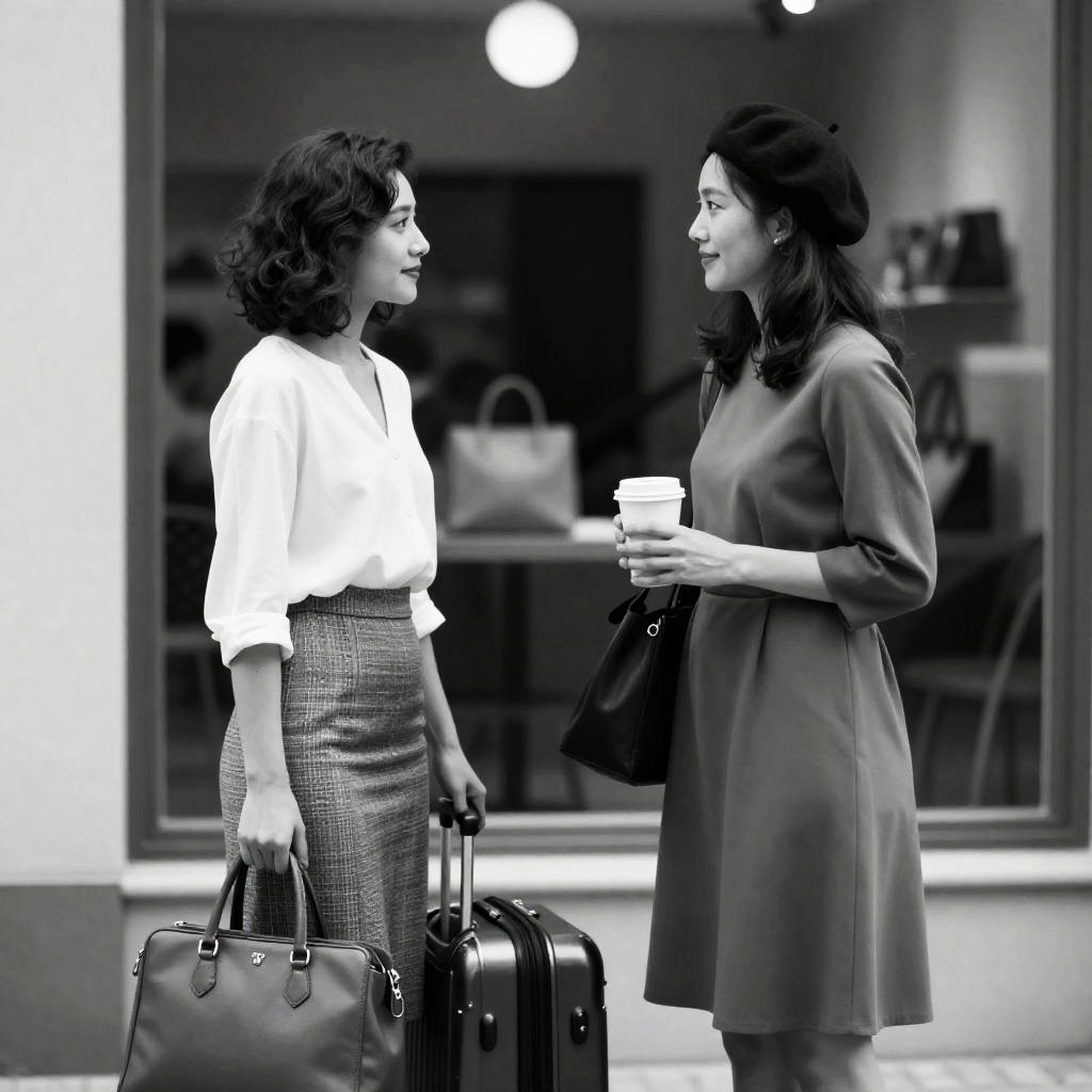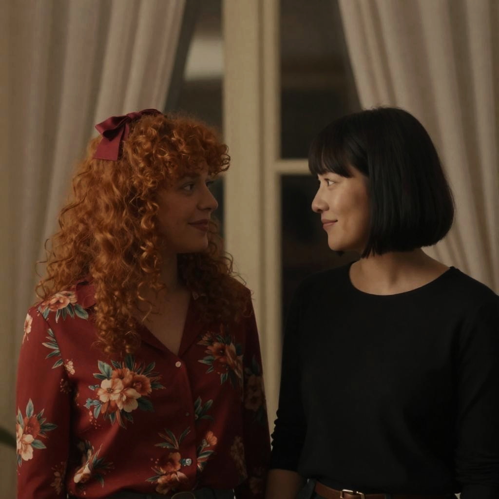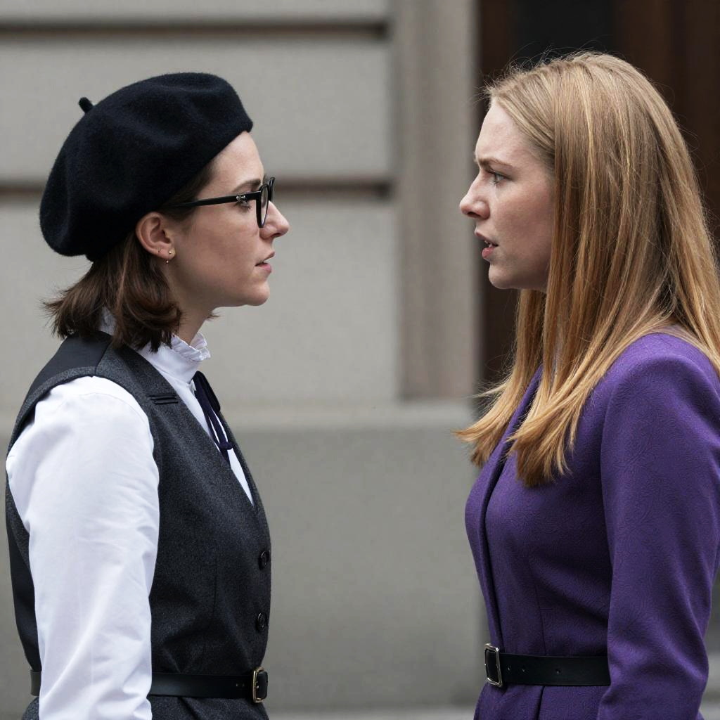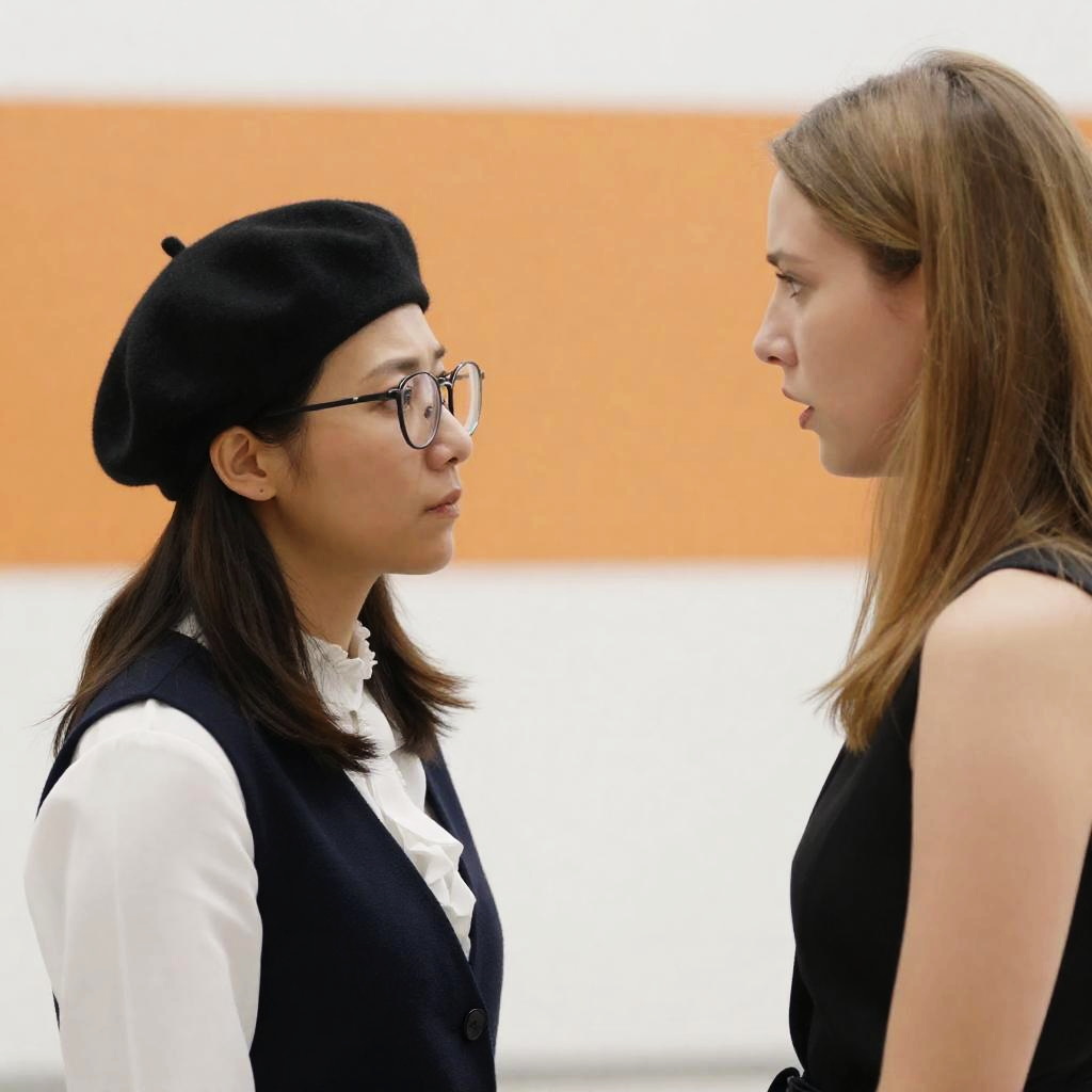 Photograph of two women. Left woman: black beret, glasses, white ruffled shirt, dark vest, serious expression. Right woman: long blonde hair, sleeveless top, surprised expression. Blurred orange and white background. Women facing each other, upper bodies.