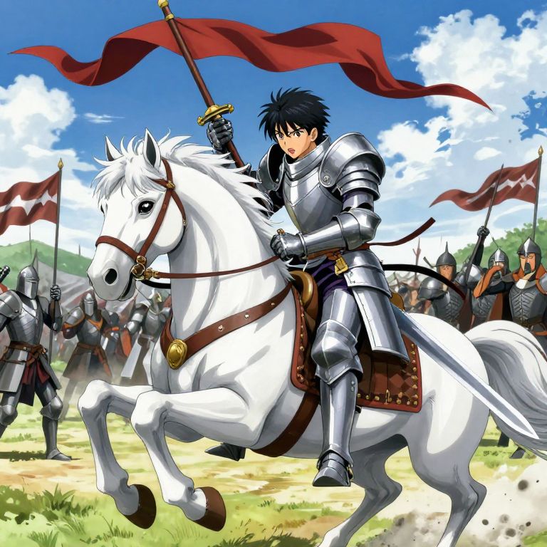 Anime male knight charging forward on a white horse, banner waving, medieval battlefield chaos in the background, detailed armor plates and intricate sword design, vivid anime style action scene.
