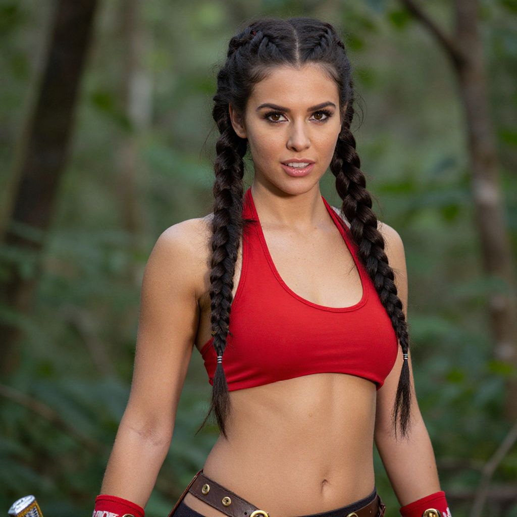 Photograph of a fit woman with long black braided hair, wearing a red sports bra, and forest background, looking confident.