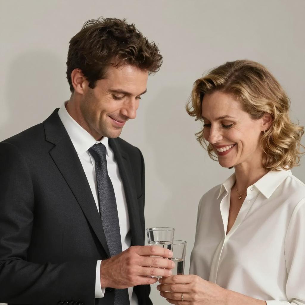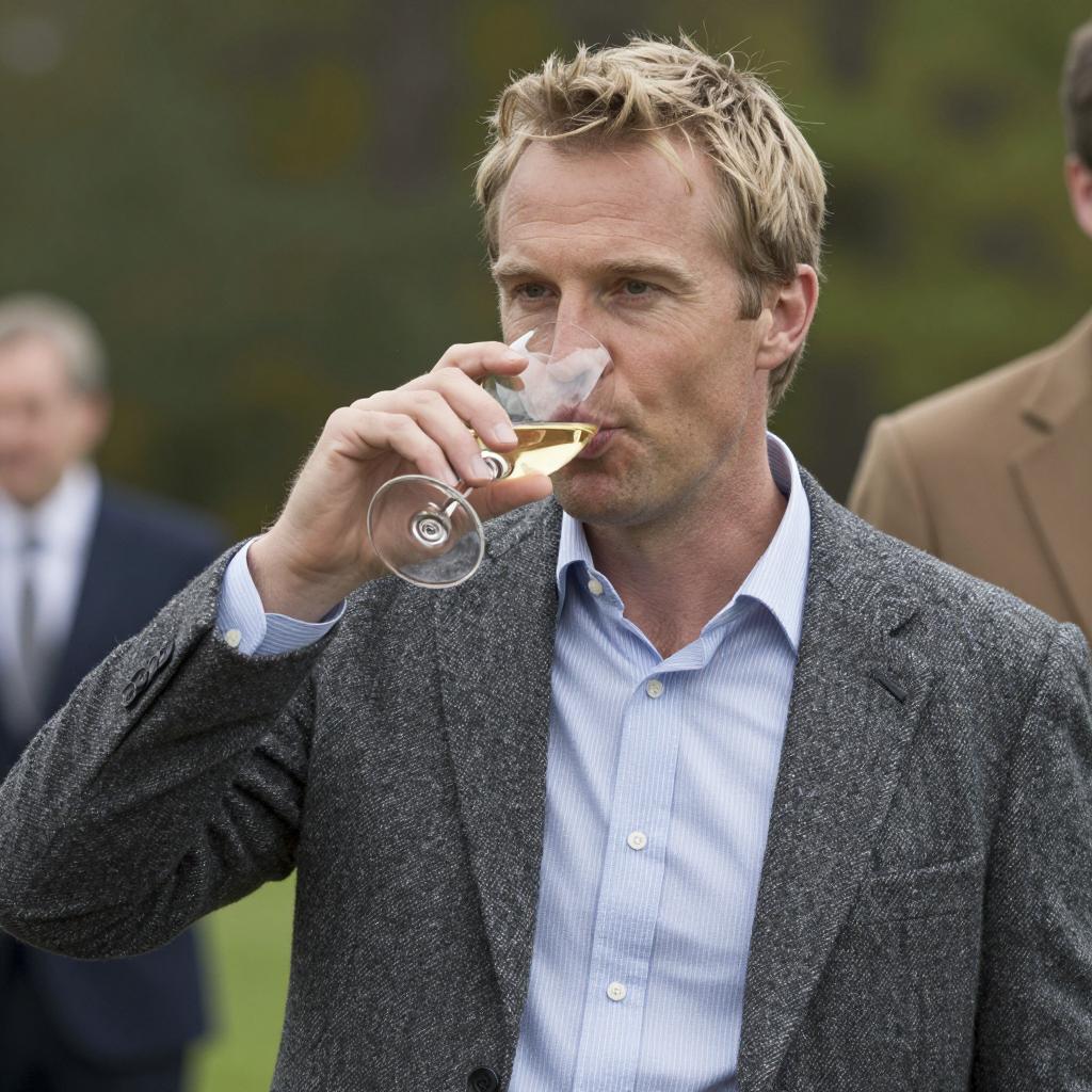 A man with light blonde hair, wearing a grey tweed suit and blue striped shirt, drinking from a glass of white wine. He has a focused expression. In the background, green trees and blurred figures. Another person's brown jacket is partially visible on the right. The man holds the glass in his right hand.