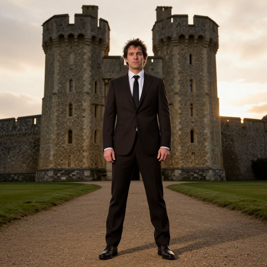 Photograph of a man standing confidently in front of a grand, medieval stone castle with tall, cylindrical towers. He's wearing a dark brown suit, white shirt, and black tie, with dark brown dress shoes. His dark, slightly messy hair contrasts with the warm, golden sunset lighting the sky behind him. The gravel path he stands on leads to the castle's entrance.