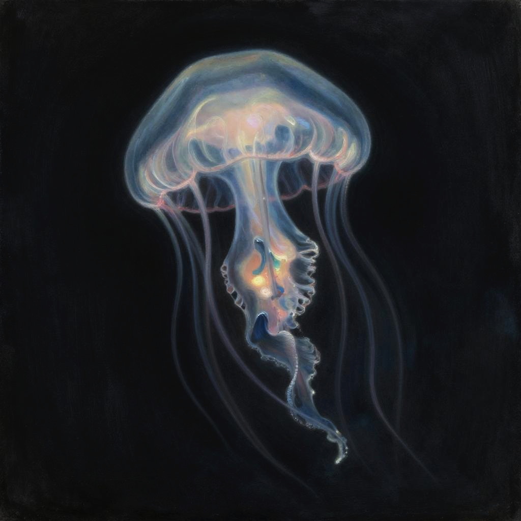 A surrealistic painting of a black cat with large yellow and green eyes and blue markings around the eyes, sitting in a field of vibrant, multicolored flowers. The background is a soft gradient of yellow and green with whimsical floral and spiral details, creating a dreamy and magical atmosphere.