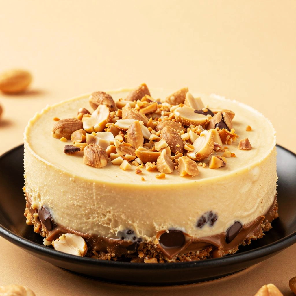 Close-up image of a creamy chocolate peanut butter cheesecake topped with chopped peanuts. The cheesecake has a smooth beige texture with visible chocolate chunks and sits on a black wavy-edged plate. The background is a warm orange-brown surface, complementing the dessert's rich colors.