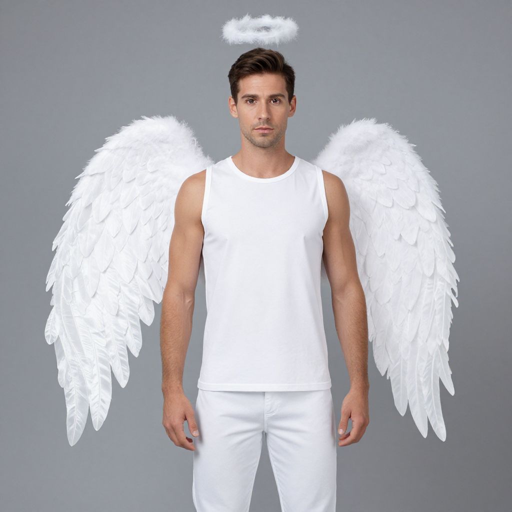 Photograph of a muscular, fair-skinned man with short brown hair, wearing a white tank top and pants, with large white angel wings and a
