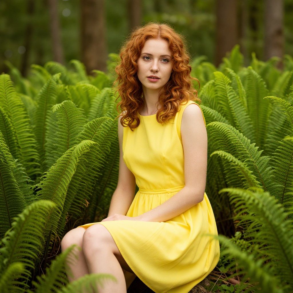 Photograph of a young woman with fair skin and curly red hair, sitting amidst lush green ferns in a forest. She wears a sleeveless, bright yellow dress that contrasts with the greenery. Her expression is calm and she gazes directly at the camera. The ferns frame her on both sides, with blurred tree trunks in the background. The lighting is natural, highlighting her hair and the vibrant color of her dress. The overall composition creates a serene and vibrant natural scene.