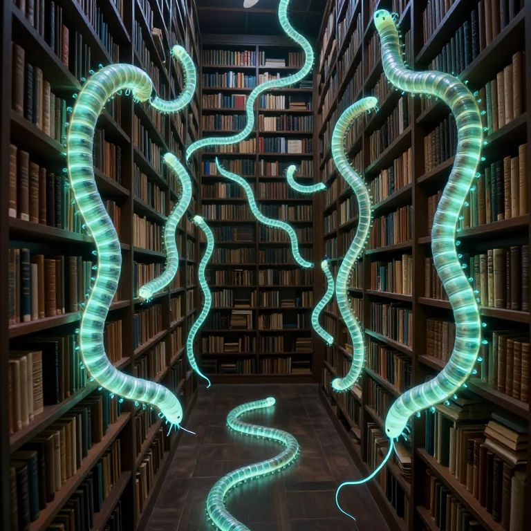 In a labyrinthine library where shelves pulse with life, bioluminescent inkworms weave endless manuscripts, their glowing trails casting a serene yet enigmatic glow, symbolizing the eternal dance between knowledge and mystery.