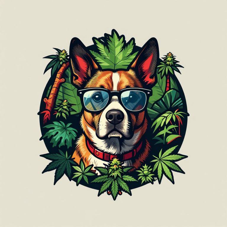 Sans Serif emblem of a stoned dog wearing glasses in the jungle, marijuana, cannabis, green and red, screen print, t-shirt vector, neutral background,