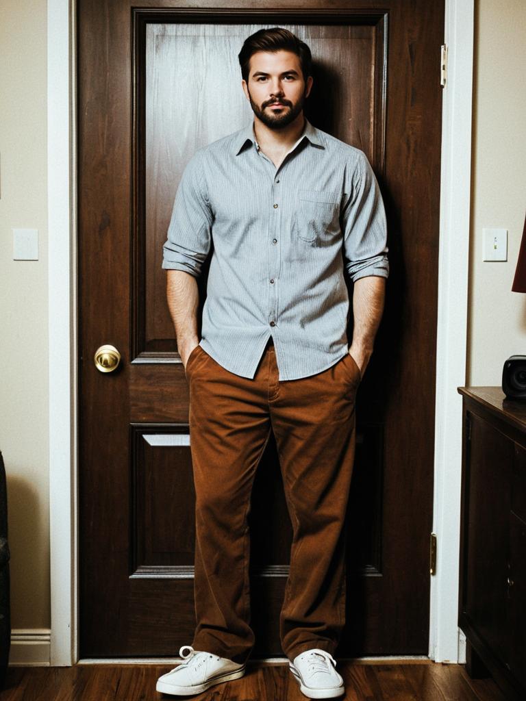 Full-body portrait of a young man with facial hair standing indoors in front of a wooden door. He is dressed in casual lounge wear, featuring a light gray collared button-up shirt with rolled-up sleeves, brown pants, and white sneakers. The setting includes a hardwood floor and part of a dark wooden cabinet visible on the right side.