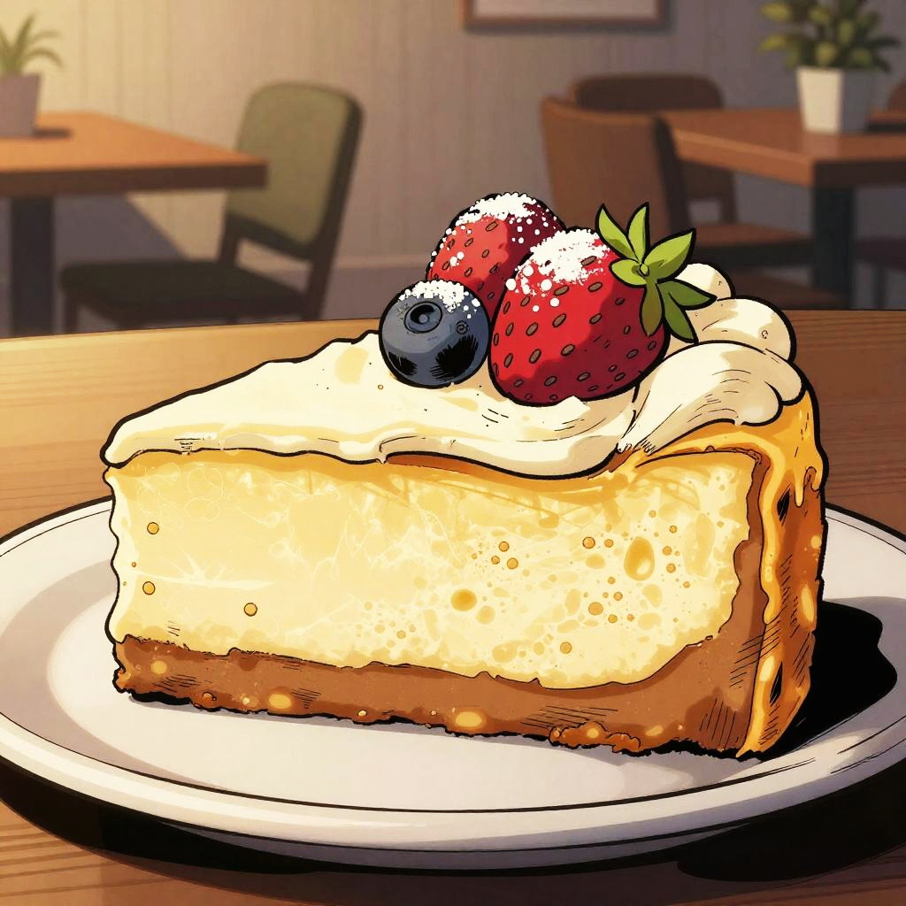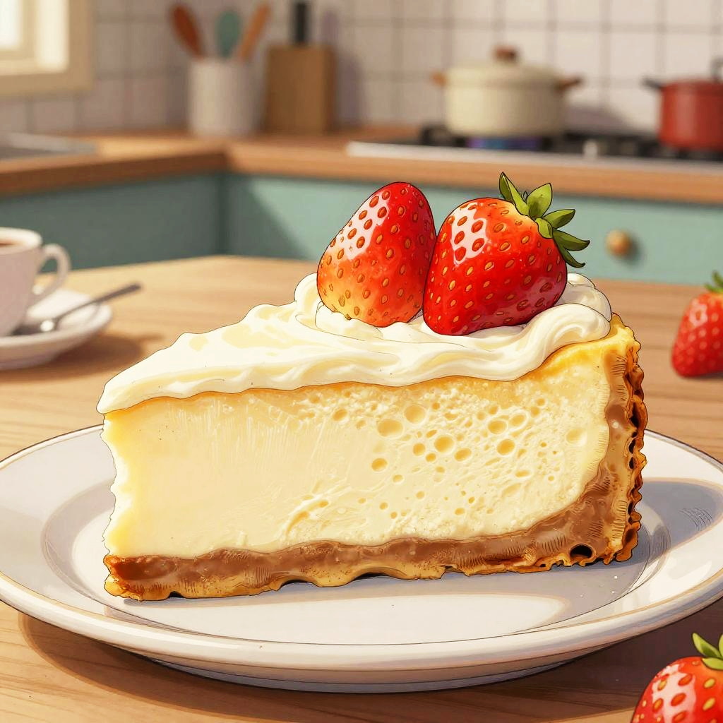 Cheesecake dessert styled in artistic Frank Cho comic book illustration, rich creamy texture, vibrant colors, detailed shading, dynamic composition, emphasizing luscious layers and glossy strawberries on top, mid-century modern kitchen background with soft lighting.