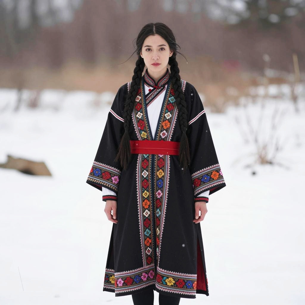 Portrait of a woman standing outdoors in a snowy winter landscape, wearing a detailed traditional-style long black robe with vibrant multicolored floral embroidery. She has long black braided hair and a red sash around her waist. The scene features a serene and muted natural background with snow on the ground and blurred trees.