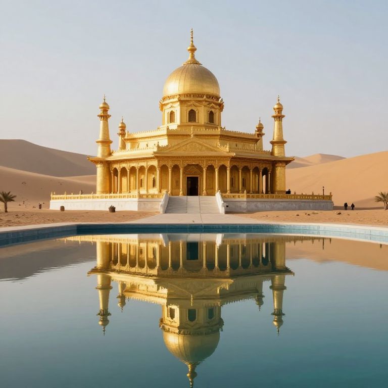 Serenity emerges from the surreal juxtaposition of a grand, golden temple rising from the desert sands, mirrored perfectly in a tranquil pool below, where the stillness of the air carries whispers of eternity and the quiet promise of reflection.