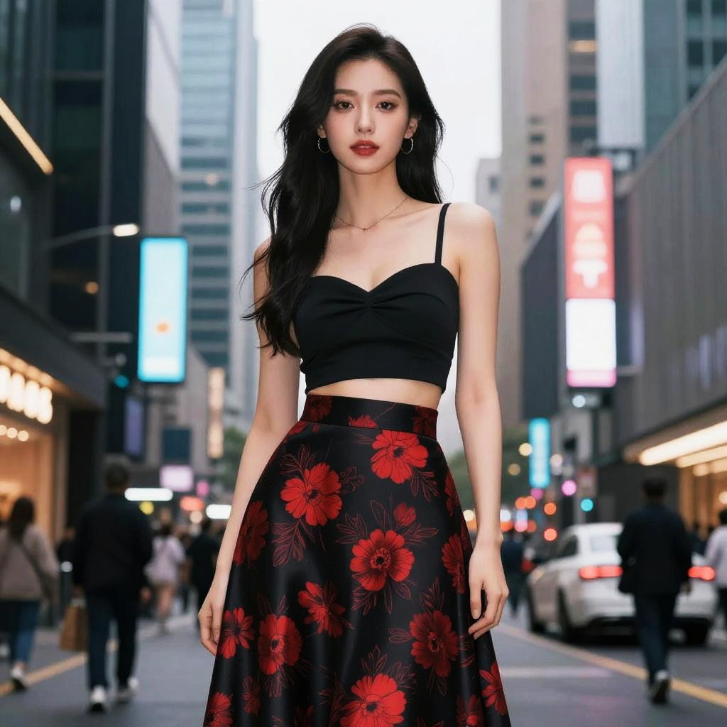 Photograph of an Asian woman with long, wavy black hair and fair skin standing in a bustling urban street at night. She wears a black, strapless crop top and a high-waisted, black skirt with vibrant red floral patterns. Her makeup is subtle with bold red lipstick. The background shows tall buildings with illuminated signs and a blurred crowd, including a few pedestrians and a white car. The street is lined with glowing lights and neon signs, creating a vibrant cityscape atmosphere. The woman's confident stance and stylish outfit contrast with the busy, colorful urban setting.