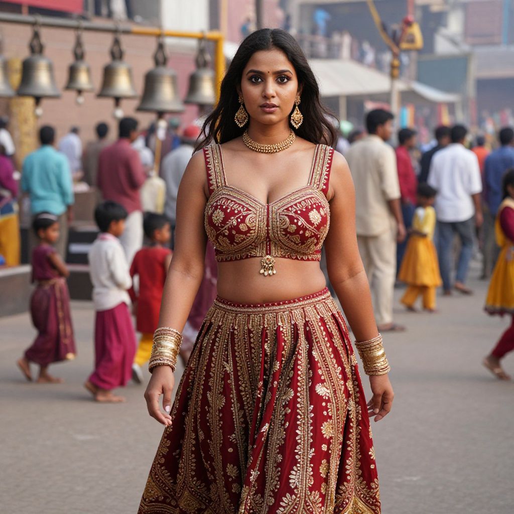 A candid-style photo of a strong, spirited woman with olive skin and bright black eyes, wearing a richly decorated long churidar costume in deep red and gold with traditional motifs, walking through a bustling festival in Varanasi with temple bells and dancing children in the background.. The woman has big tits and cute face