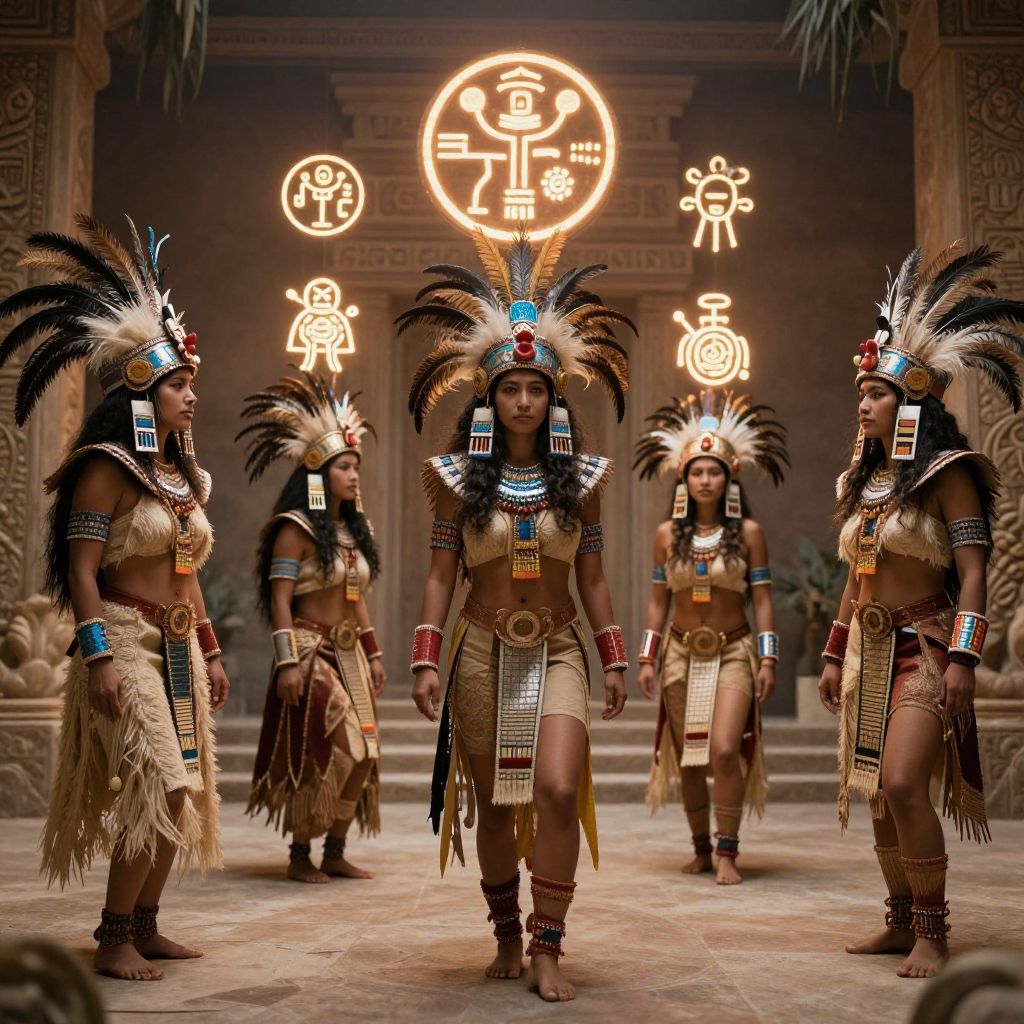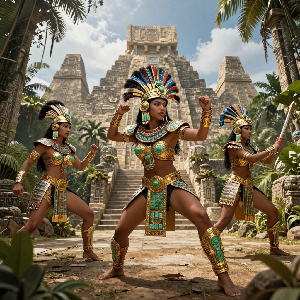 Aztec women warriors marching with spears and shields, adorned with colorful feathers and symbolic jewelry, smoky battlefield setting with fiery skies, intense and powerful atmosphere