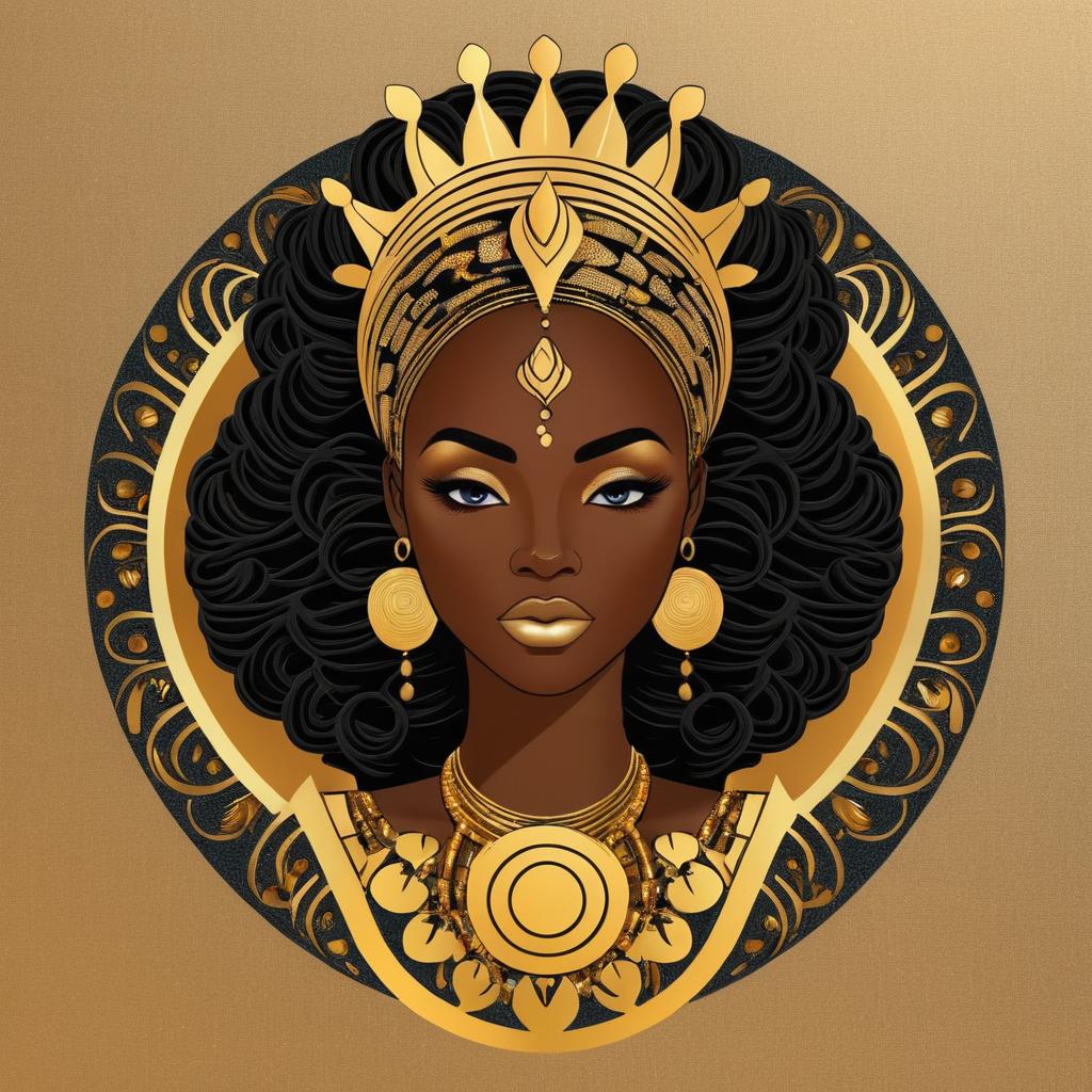 Digital artwork of a regal African queen with dark skin and voluminous curly black hair styled with a traditional golden headwrap. She is adorned with large gold earrings, an ornate gold necklace, and intricate gold face adornments. The background features a decorative gold and black circular pattern, highlighting her royal and elegant presence.
