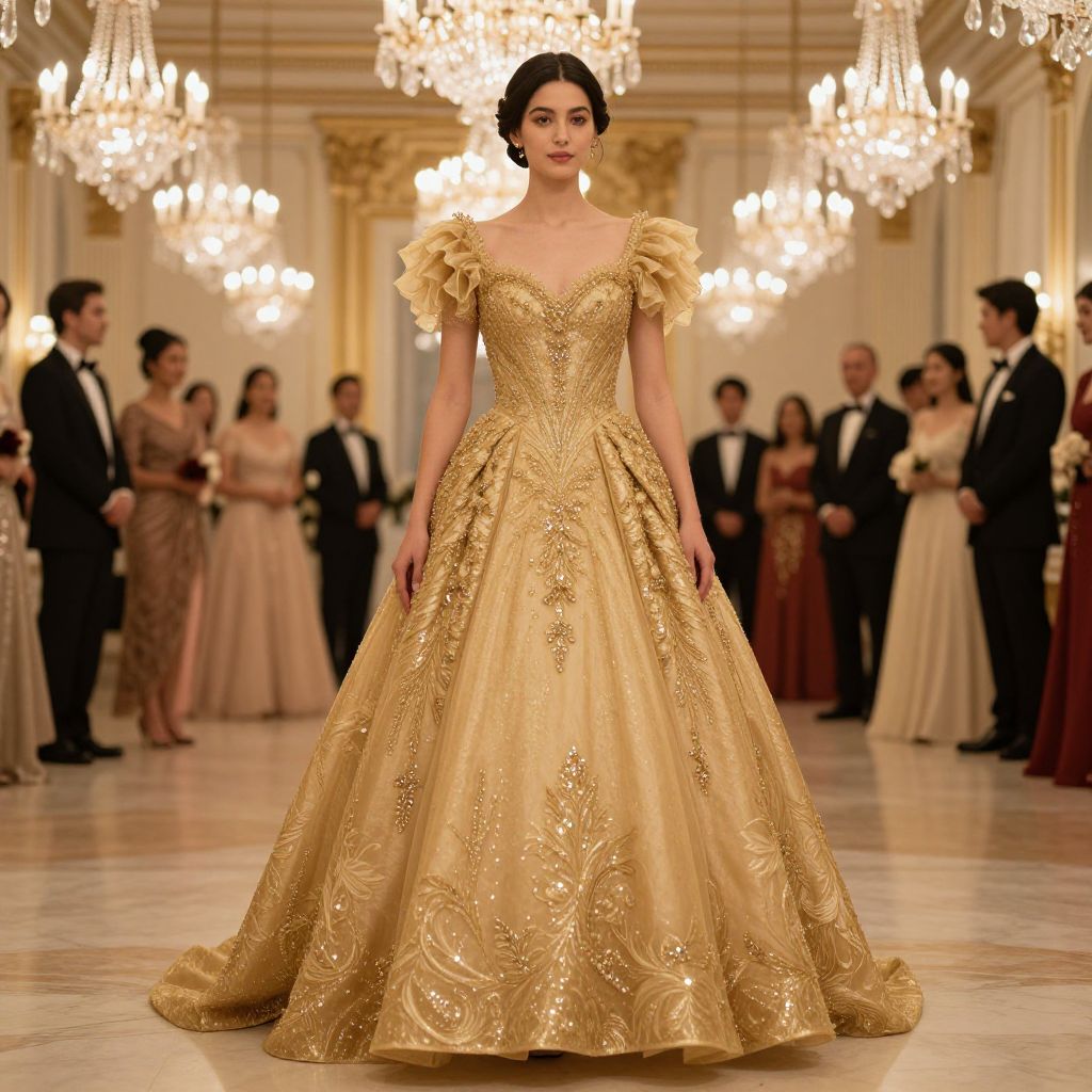 A woman stands elegantly in a luxurious ballroom, wearing an intricate gold ball gown adorned with sparkling embellishments and delicate ruffled sleeves. The opulent setting features crystal chandeliers and guests dressed in formal attire, highlighting a sophisticated, classic glamour style.