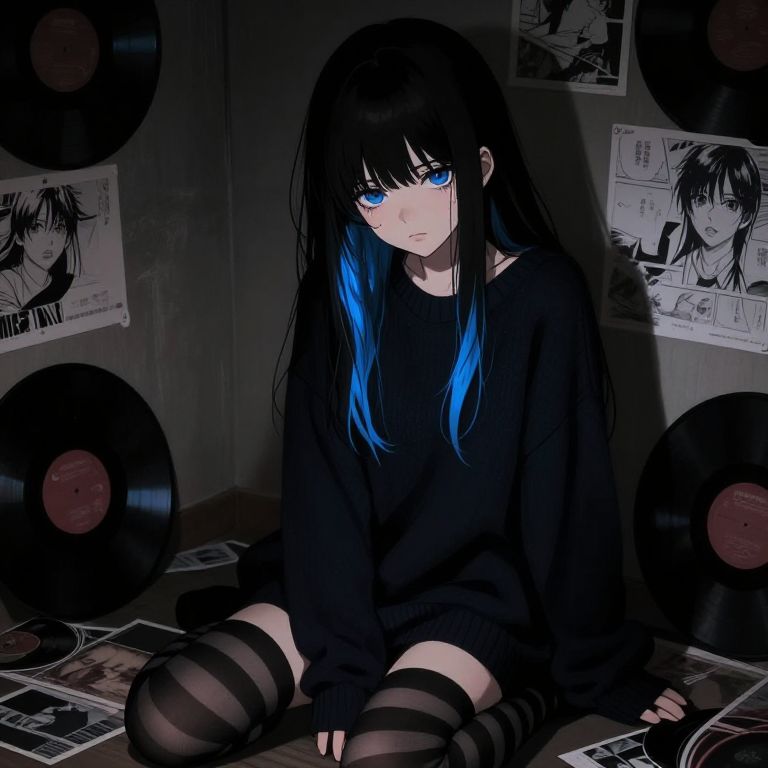 Emo black anime girl in a dimly lit room, surrounded by posters and scattered vinyl records, wearing a dark oversized sweater and striped stockings, piercing gaze with subtle tears, artistic manga style, muted color palette with bursts of electric blue highlights.