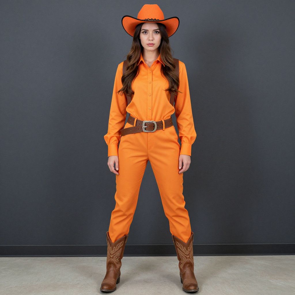"orange cowgirl costume, solo, hat, cowboy hat, vest, cowboy western, 1girl, belt, brown hair, boots, long hair, shirt, pants, cowboy boots, full body, standing, male focus, 1boy Realistic photo of casual sexy person with pretty face"