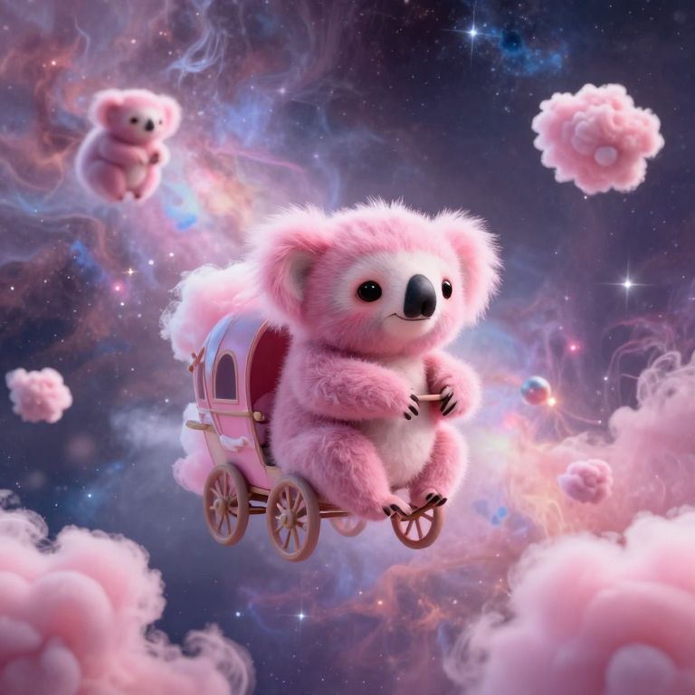 Digital art of a cute, fluffy pink koala in a tiny carriage flying through a whimsical, starry, pink and purple cosmic sky with floating