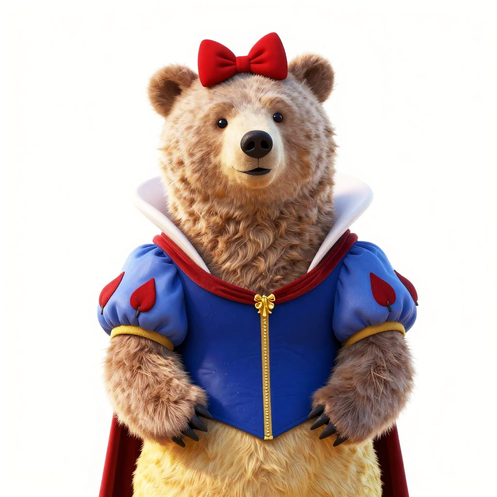 Realistic photo.bear dressed as a Snow White posing for an image, whimsical and playful tone. realistic photo