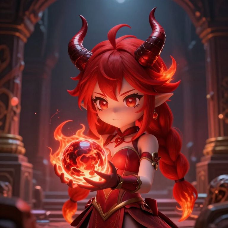 Digital art of a cute, red-haired demon girl with black horns, holding a fiery orb in a dark, ornate archway.