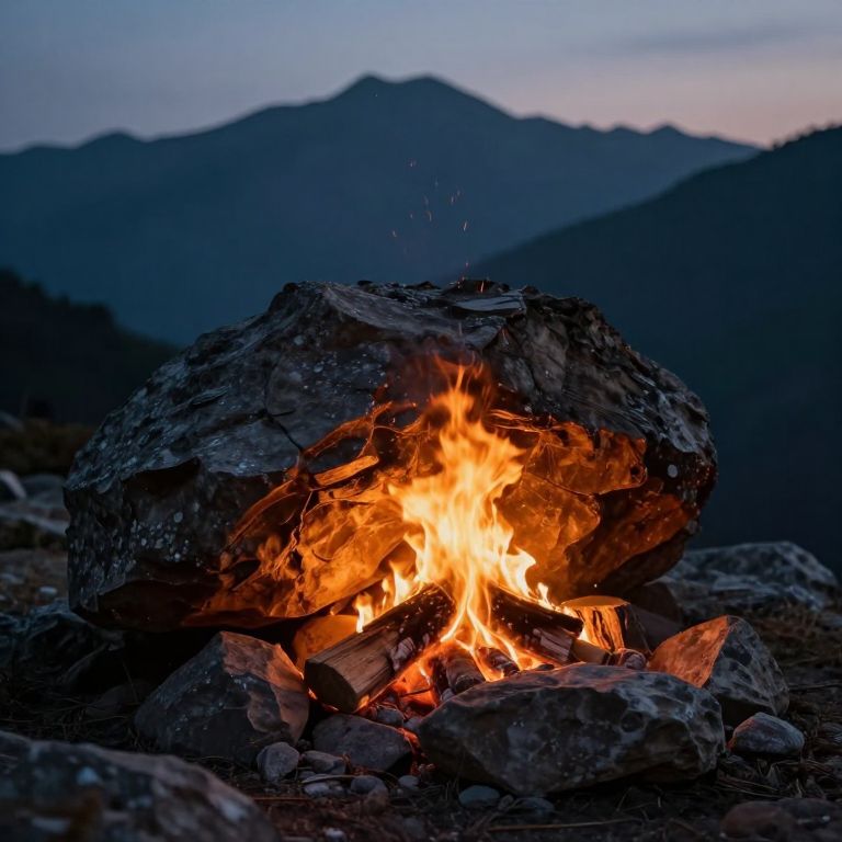 Amidst the solemn embrace of ancient mountains, a luminous boulder cradles the warmth of forgotten fires, casting an ethereal glow that whispers of resilience and the enduring spirit of time.