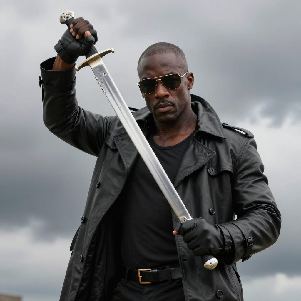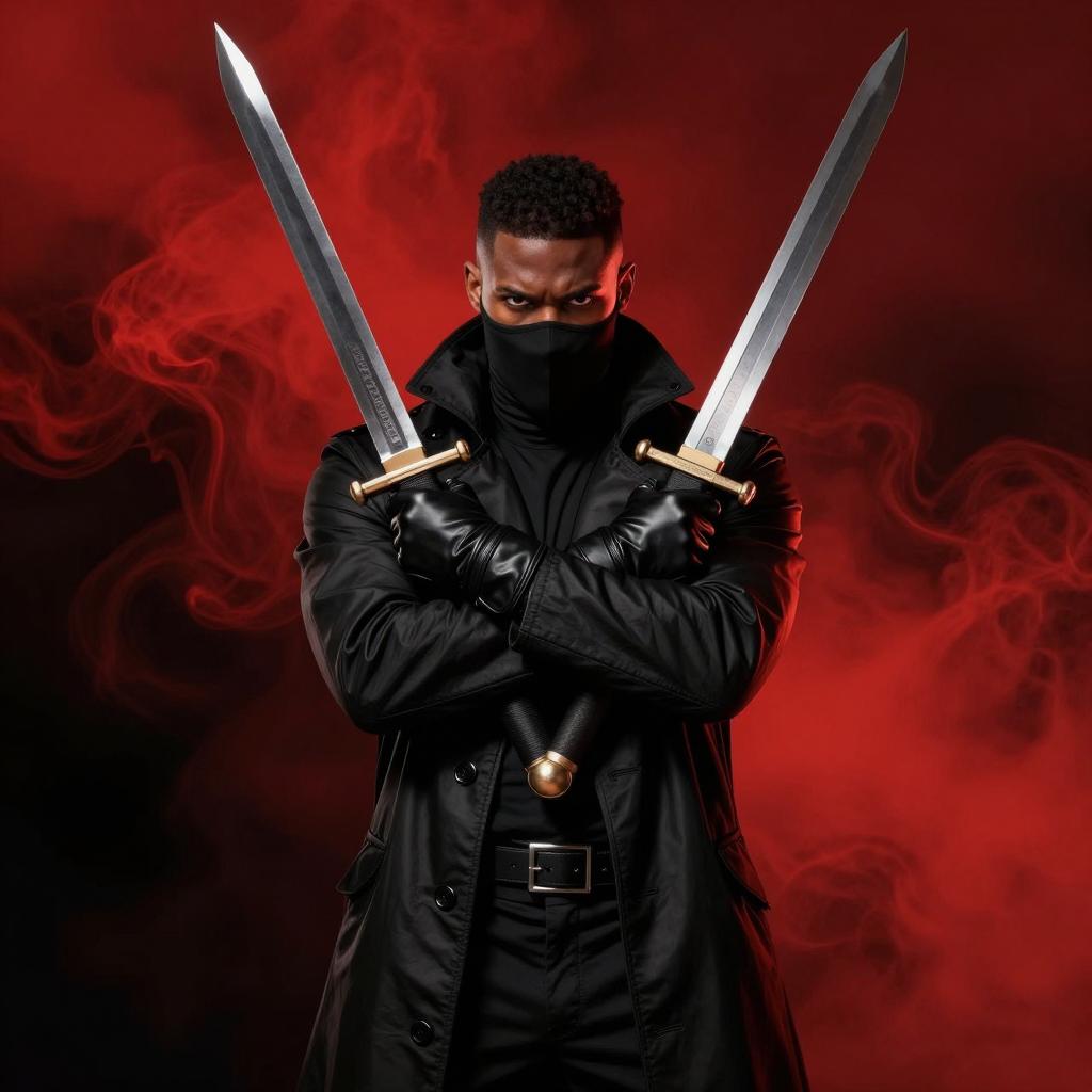 Muscular man with dark skin, wearing black leather gloves, black mask, and long black coat, holds two large swords overhead. Bright red smoke in background. Right side of image, left side black. He stands with arms crossed. Intense expression. Digital illustration.