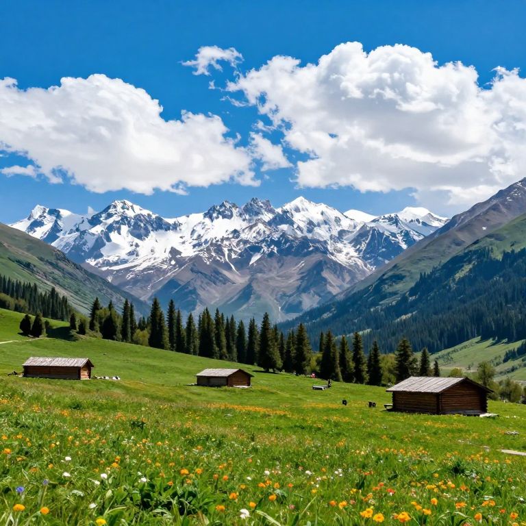 Photograph of a vibrant alpine landscape featuring a foreground of lush green meadow with wildflowers, dotted with small wooden cabins. Mid-ground shows a dense line of dark green pine trees. The background boasts a majestic range of snow-capped mountains under a bright blue sky with fluffy white clouds. The scene is bathed in natural sunlight, enhancing the vivid colors and textures of the grass, flowers, and mountains. The overall atmosphere is serene and picturesque, capturing the beauty of a remote mountainous area.