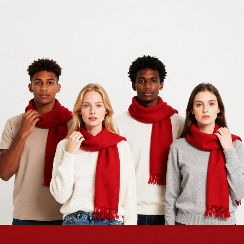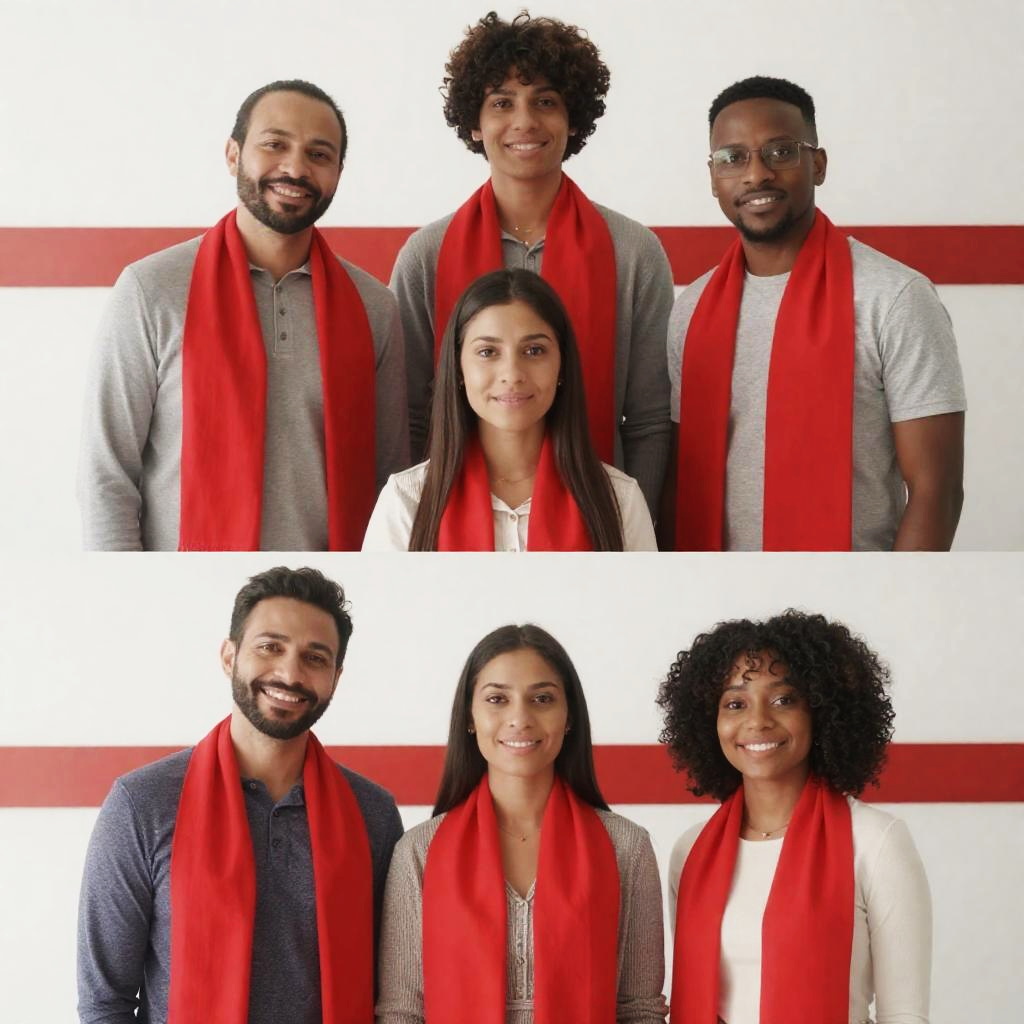 Photograph of six diverse people, three men and three women, wearing red scarves. Top row: standing, smiling, mixed ethnicities. Bottom row: standing close, red scarves around necks, smiling. Background: white with red horizontal stripes. Casual, friendly attire.