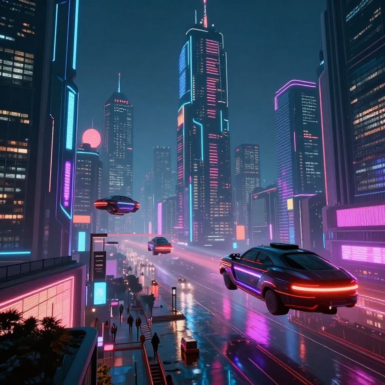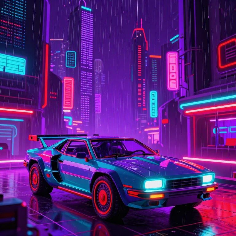 Vibrant retro cyberpunk color palette with electric purple, neon cyan, and intense red shades flooding a dystopian city at night, featuring retro-futuristic vehicles, digital rain, and grid patterns, rendered in sharp contrast and high saturation for immersive sci-fi visuals.