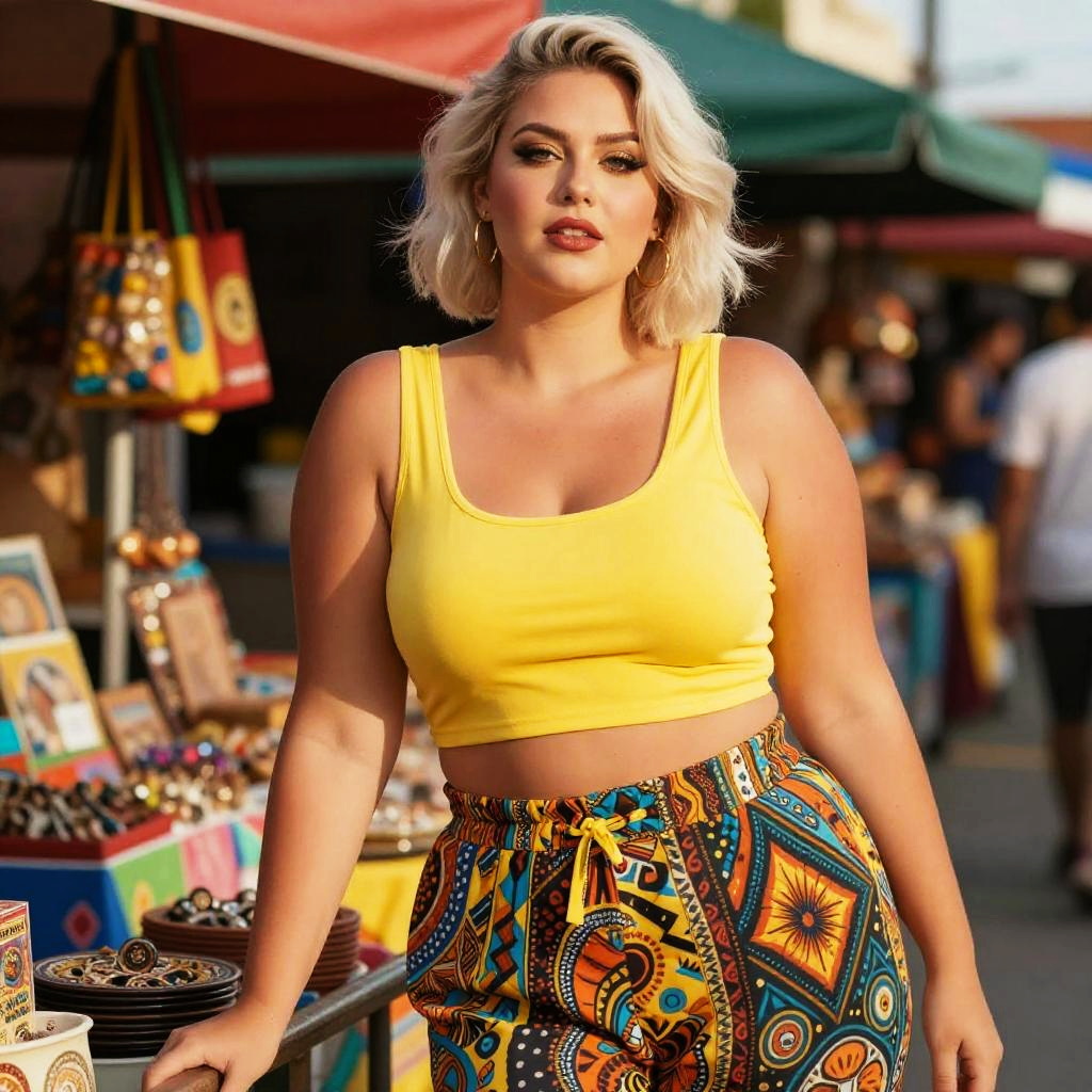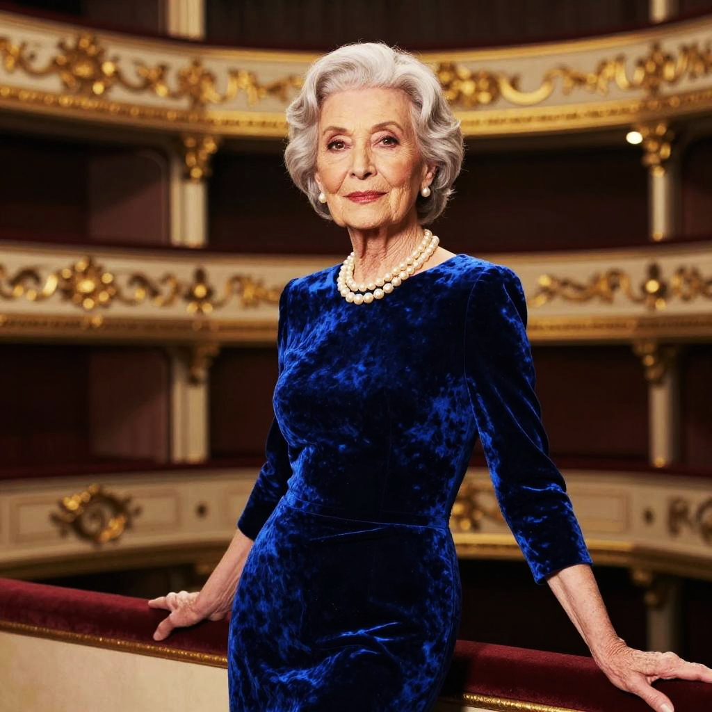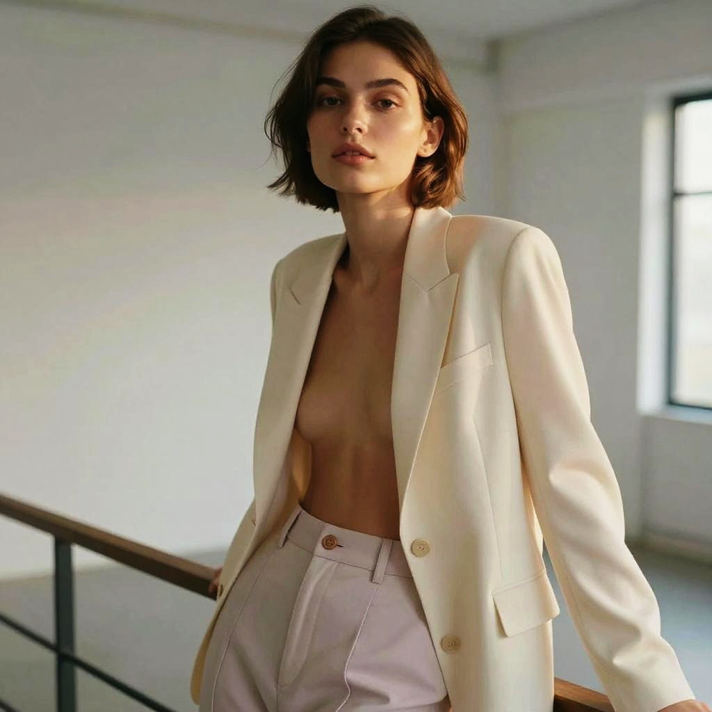 Photorealistic fashion editorial portrait of middle-aged woman with straight shoulder-length blonde hair, wearing navy blue pantsuit with white silk blouse, leaning against a railing in modern art gallery interior with abstract paintings. Golden-hour warmth skims her skin; soft rim light shapes her silhouette; confident gaze meets the lens. Shallow depth of field, natural skin texture, fine fabric detail, tasteful color contrast, subtle film grain, high dynamic range, clean composition, professional finish.
