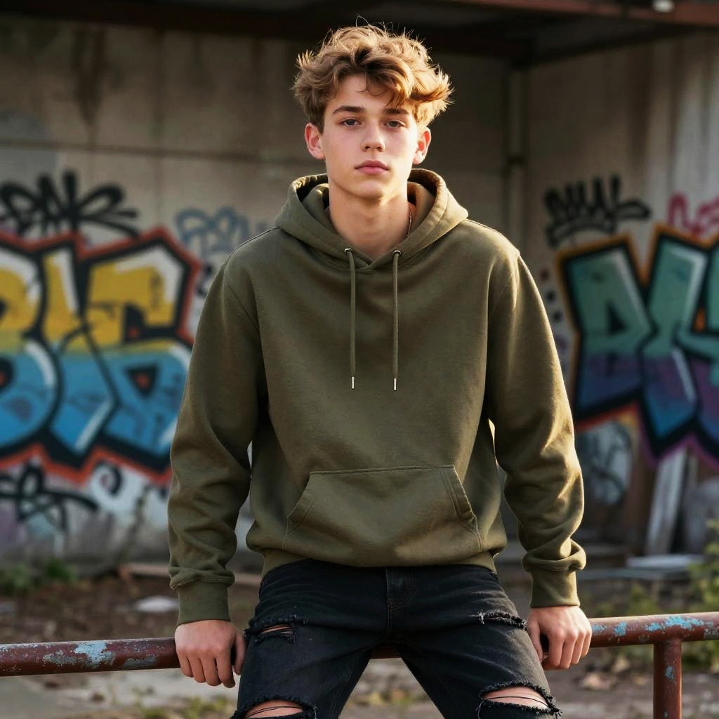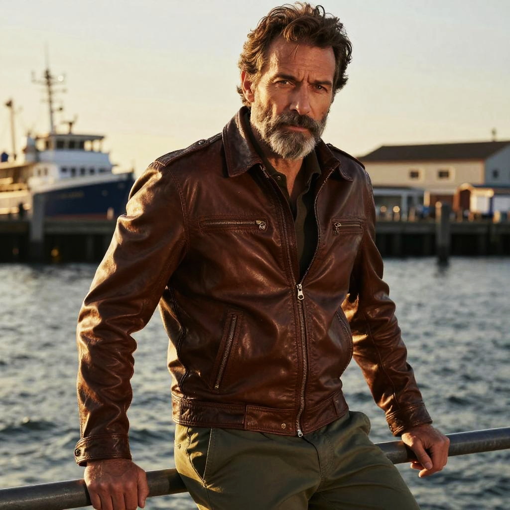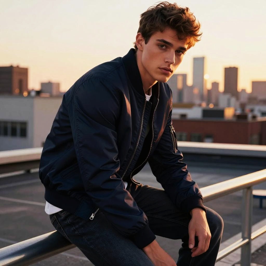 Photorealistic fashion editorial portrait of middle-aged woman with straight shoulder-length blonde hair, wearing navy blue pantsuit with white silk blouse, leaning against a railing in modern art gallery interior with abstract paintings. Golden-hour warmth skims her skin; soft rim light shapes her silhouette; confident gaze meets the lens. Shallow depth of field, natural skin texture, fine fabric detail, tasteful color contrast, subtle film grain, high dynamic range, clean composition, professional finish.