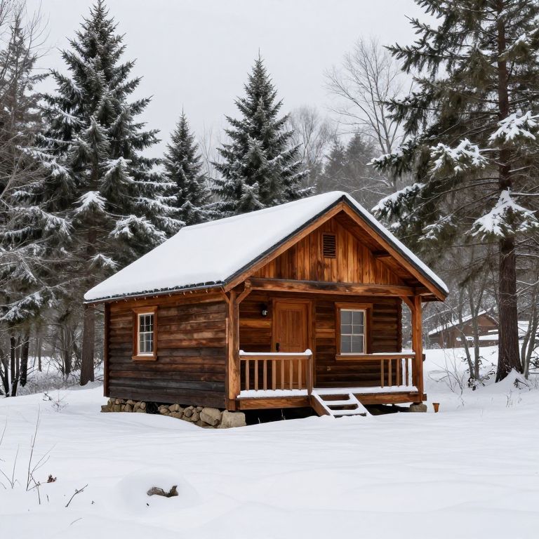 Photograph of a small, rustic wooden cabin with a steep, snow-covered roof, situated in a snowy forest. The cabin has a prominent front porch with wooden steps leading up to it. Tall, snow-laden evergreen trees surround the cabin, creating a dense, wintery backdrop. The wooden walls of the cabin are dark brown, contrasting with the bright white snow. A single window is visible on the side, and a small window is above the porch. The scene is serene and quiet, evoking a sense of isolation and tranquility in a winter wonderland.