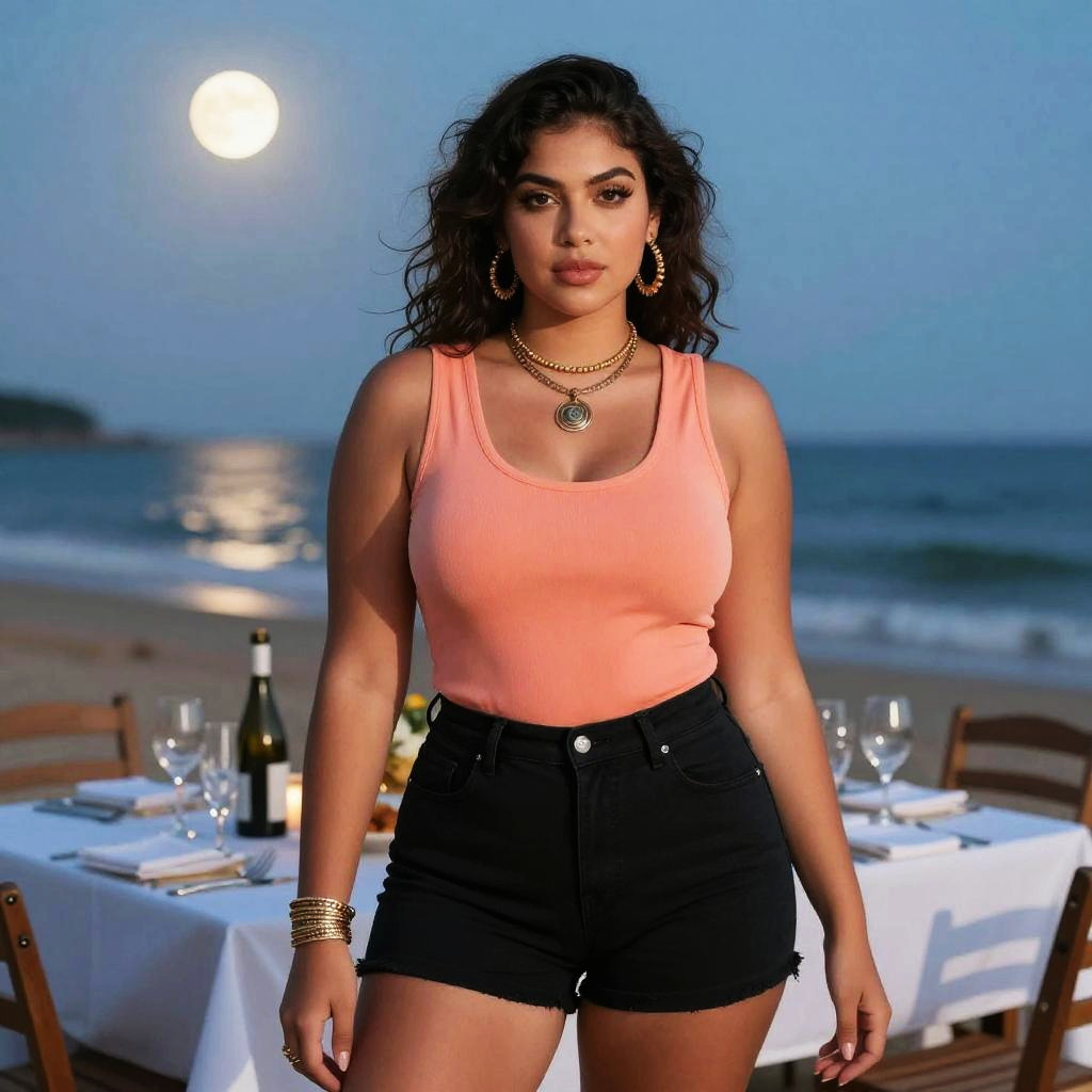 A Curvy woman, in a casual bohemian style with a sleeveless coral top and black fitted shorts, stands at a Dusk Beach Dinner with a Moonlit Sky, embodying the vibrant visual style of Shogakukan. Sexy. Pretty face and beutiful eyes