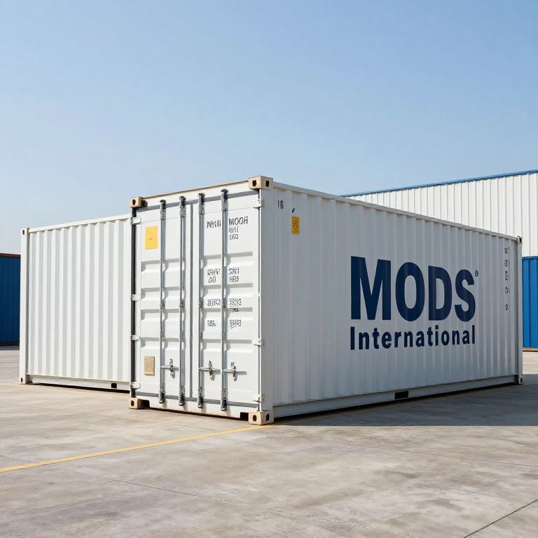 Photograph of a large white shipping container with the text "MODS international" in bold blue letters on the side. The container is rectangular, with multiple doors and black hinges. It sits on a concrete surface with yellow lines, under a clear blue sky. Another similar container is partially visible in the background, positioned to the left. The container's surface is smooth, and the lighting is bright, casting minimal shadows. The overall setting suggests an industrial or shipping yard.