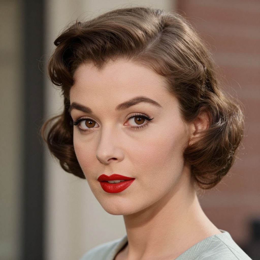 A vintage-inspired portrait featuring a woman with classic 1950s styling, including a polished bob hairstyle and bold red lipstick, captured in a high-definition photograph reminiscent of March Vogue 1956, with soft, natural lighting accentuating her elegant features.