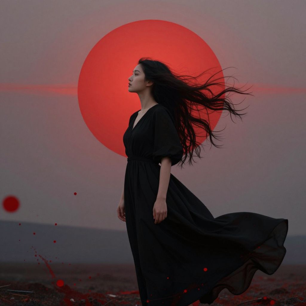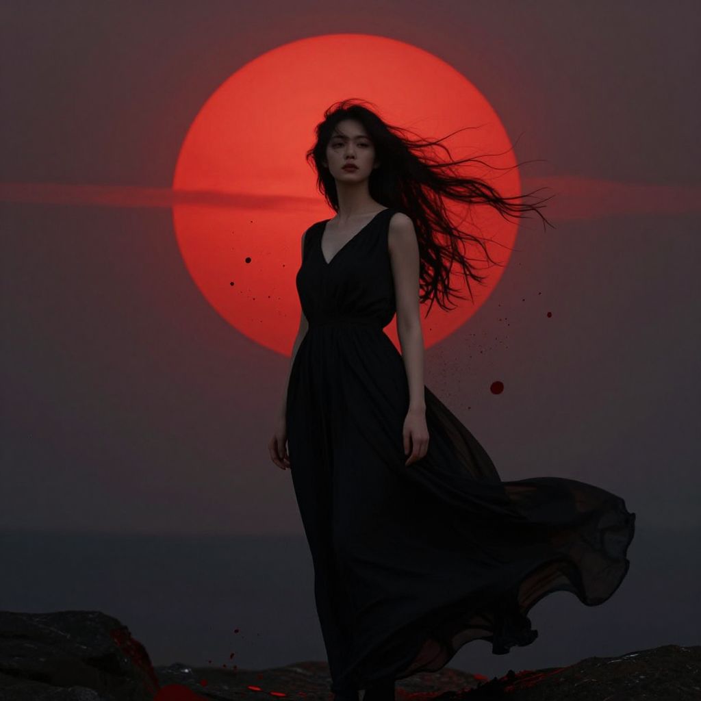 Photograph of a young woman with long, flowing black hair standing against a dramatic, twilight sky. She wears a sleeveless, black, V-neck dress that billows in the wind. Her pale skin contrasts with the dark dress. Behind her, a large, glowing red sun dominates the sky, casting an eerie red glow. The horizon is a gradient of dark purple and blue, with scattered red particles floating in the air. The woman's expression is serene yet intense, and the overall composition evokes a sense of mystery and otherworldliness.