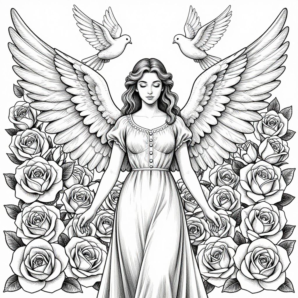 The image is a highly detailed, black-and-white illustration of a female figure with angelic wings, reminiscent of a coloring book page. The woman is adorned in a flowing, elegant dress with a buttoned front, her hair styled in loose waves that cascade down her shoulders. Her wings, large and detailed, extend from her back, with feathers meticulously drawn to give a sense of depth and texture. Two doves, symbolizing peace and purity, fly above her, adding to the ethereal quality of the scene. The background is filled with a dense arrangement of roses, their petals intricately shaded to create a sense of volume and realism. The overall composition is balanced, with the woman centrally positioned, her wings and the doves creating a harmonious visual rhythm. The interplay of lines and shading in the wings, dress, and roses adds a dynamic quality to the image, making it visually engaging and rich in detail.