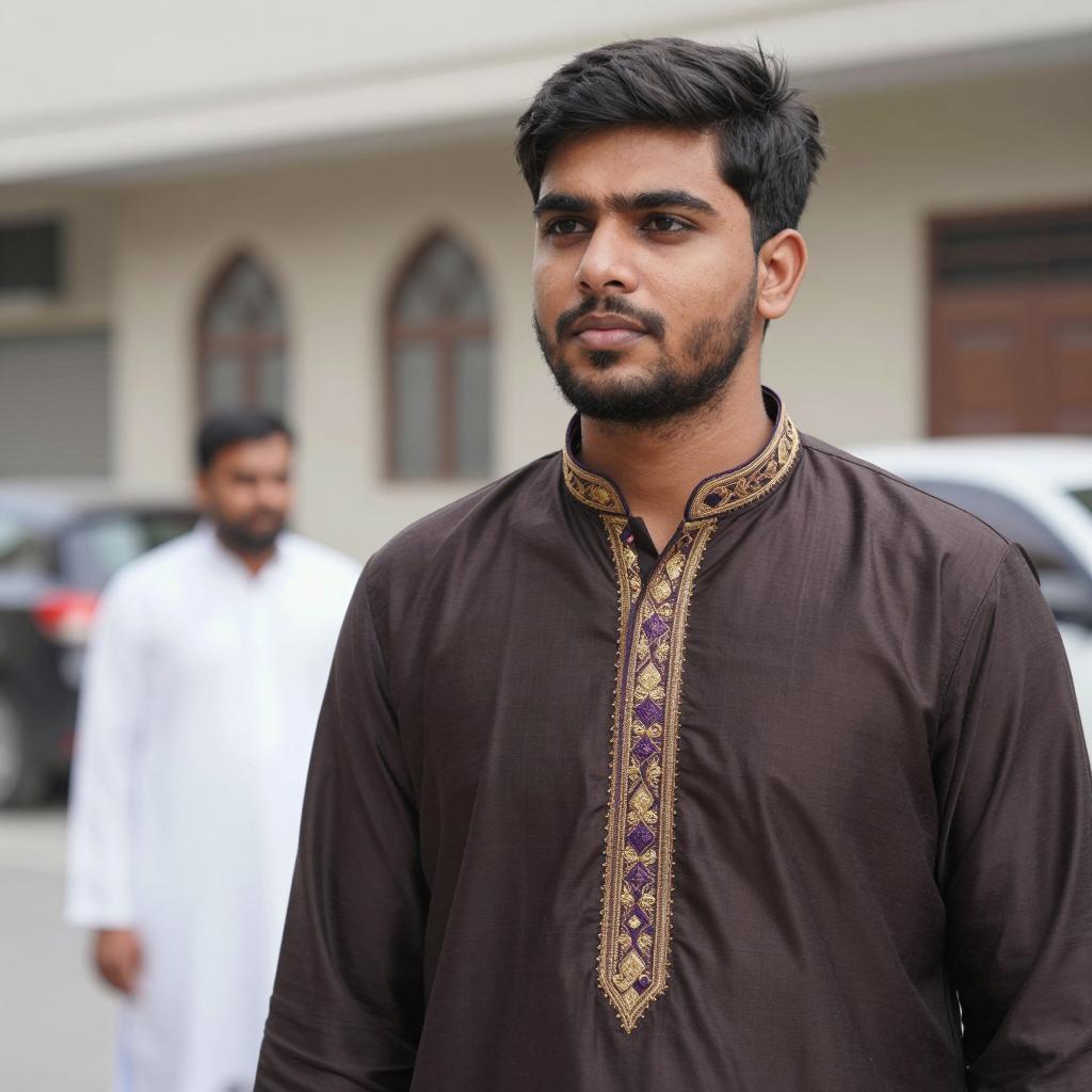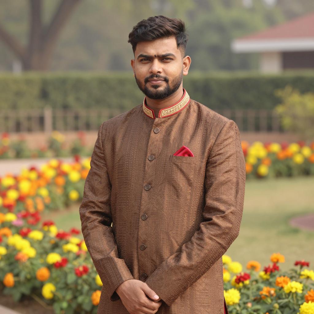 Navy blue sherwani man, photorealistic, male, standing, outdoor, daytime, blurry background, flower garden, red and pink flowers, blue salwar kameez, long sleeves, buttoned up, red pocket square, short beard, dark hair, serious expression, natural light, summer, Indian attire, greenery, floral path, slightly blurred background, realistic ures, detailed clothing, vertical image, high contrast, bright colors