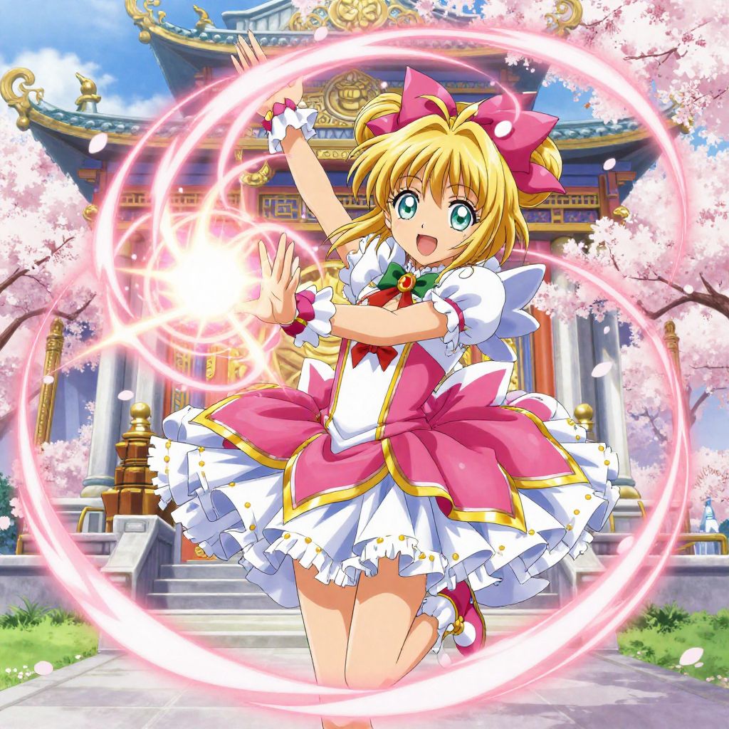 Random animated character generator illustrating a magical girl with elemental powers, sparkling effects, vibrant magical aura, colorful outfit with flowing ribbons, fantasy city skyline in background, anime-inspired style, bright and energetic composition