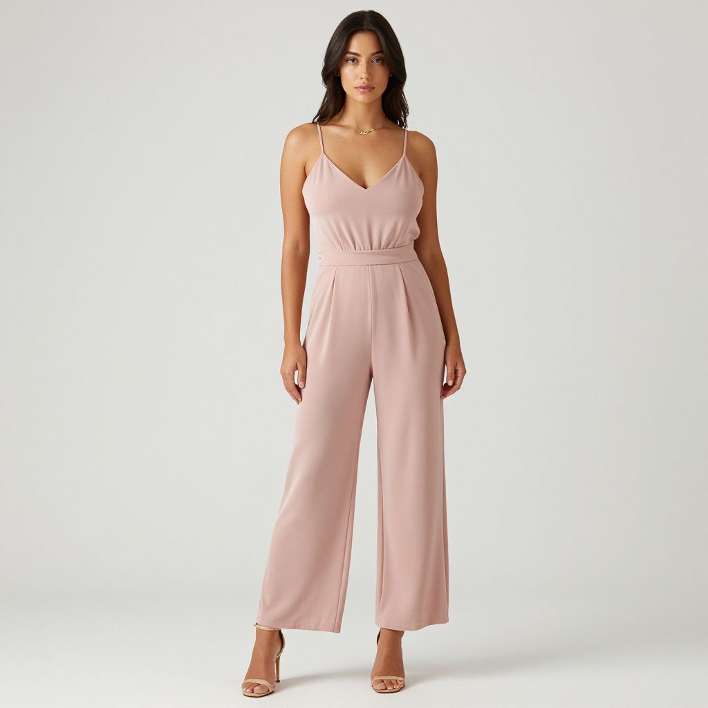 Photograph of a young woman with medium brown skin and long black hair, standing against a plain white background. She wears a pale pink, sleeveless, deep V-neck jumpsuit with a high waist and wide-leg pants, cinched at the waist. The jumpsuit has thin spaghetti straps. She is also wearing nude, open-toed high heels. Her expression is neutral, and she stands with her arms relaxed by her sides. The fabric of the jumpsuit appears smooth and slightly flowy. She has a slender build and is wearing a simple gold necklace. The image is well-lit, highlighting the soft pink color of the jumpsuit.