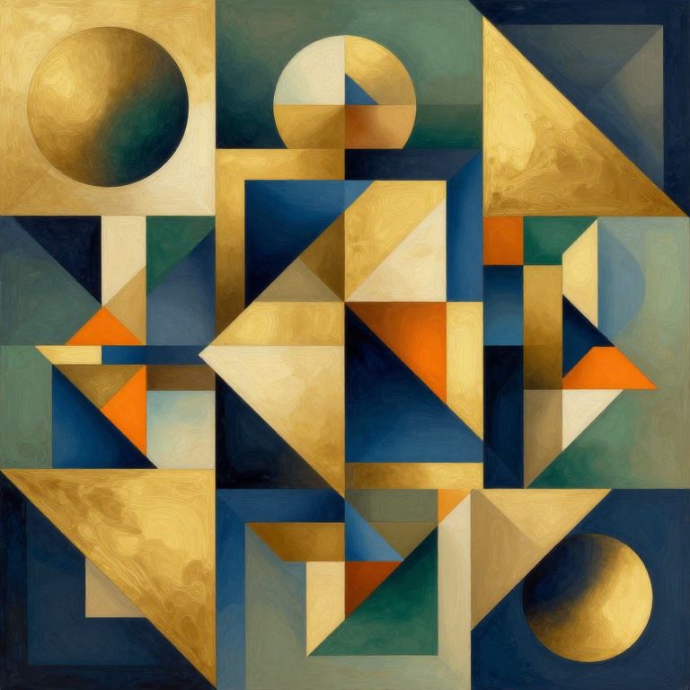 The image presents a highly detailed, abstract neo-abstract surrealist composition featuring a complex interplay of geometric shapes and vibrant colors. Dominating the scene are a series of interlocking squares, triangles, and circles, each rendered with a hyper-realistic photorealistic quality. The squares and triangles are arranged in a dynamic, almost chaotic manner, creating a sense of depth and movement. The circles, both large and small, are interspersed throughout, adding a sense of rhythm and balance to the composition. The colors are rich and varied, with shades of gold, blue, green, and orange creating a visually striking contrast. The textures of the shapes are smooth and glossy, giving the image a sense of three-dimensionality and realism. The overall composition is intricate and thoughtfully arranged, with each element carefully positioned to create a harmonious yet complex visual experience.