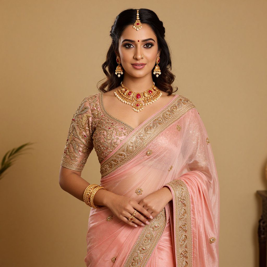 Photograph of a beautiful Indian woman in a pink saree with gold embroidery, wearing traditional jewelry, including a maang tikka, and standing against