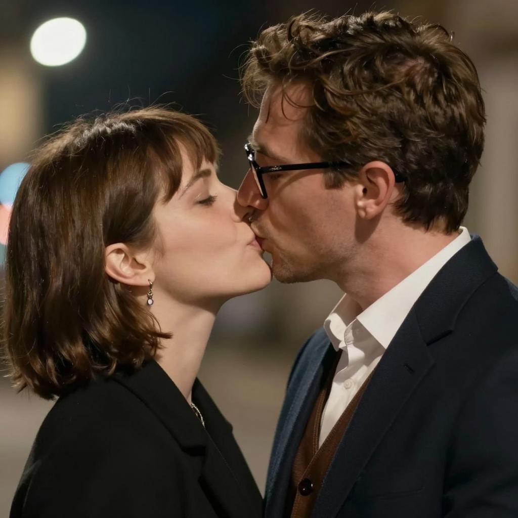 Photograph of a close-up, intimate moment between a man and a woman. The man has short brown hair, glasses, and is wearing a white shirt. The woman has short, light brown hair, and is smiling, wearing heart-shaped earrings. They are facing each other, noses almost touching, with a blurred bokeh background of yellow lights.